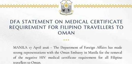 MANILA, Philippines — April 17, 2026 The Department of Foreign Affairs (DFA) has formally urged Omani authorities to remove the requirement for Filipino travelers to present a negative HIV medical certificate prior to entry into Oman. In a statement released …