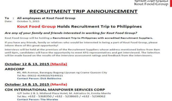 Kout Food Group will be holding a Recruitment Trip to Philippines with accredited Recruitment Suppliers.