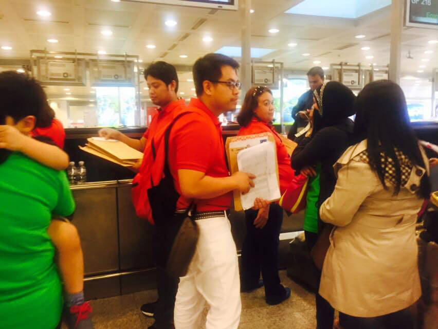 REPATRIATION STORIES 2015: The latest batch of repatriations ( 96 OFWs ) leave for the Philippines, 23 October. The OFWs include those who had been rescued from abuse and maltreatment, aside from those who have been overstaying. Passports were extended to facilitate travel. Embassy staff ( in red ) assist OFWs ( in green ).