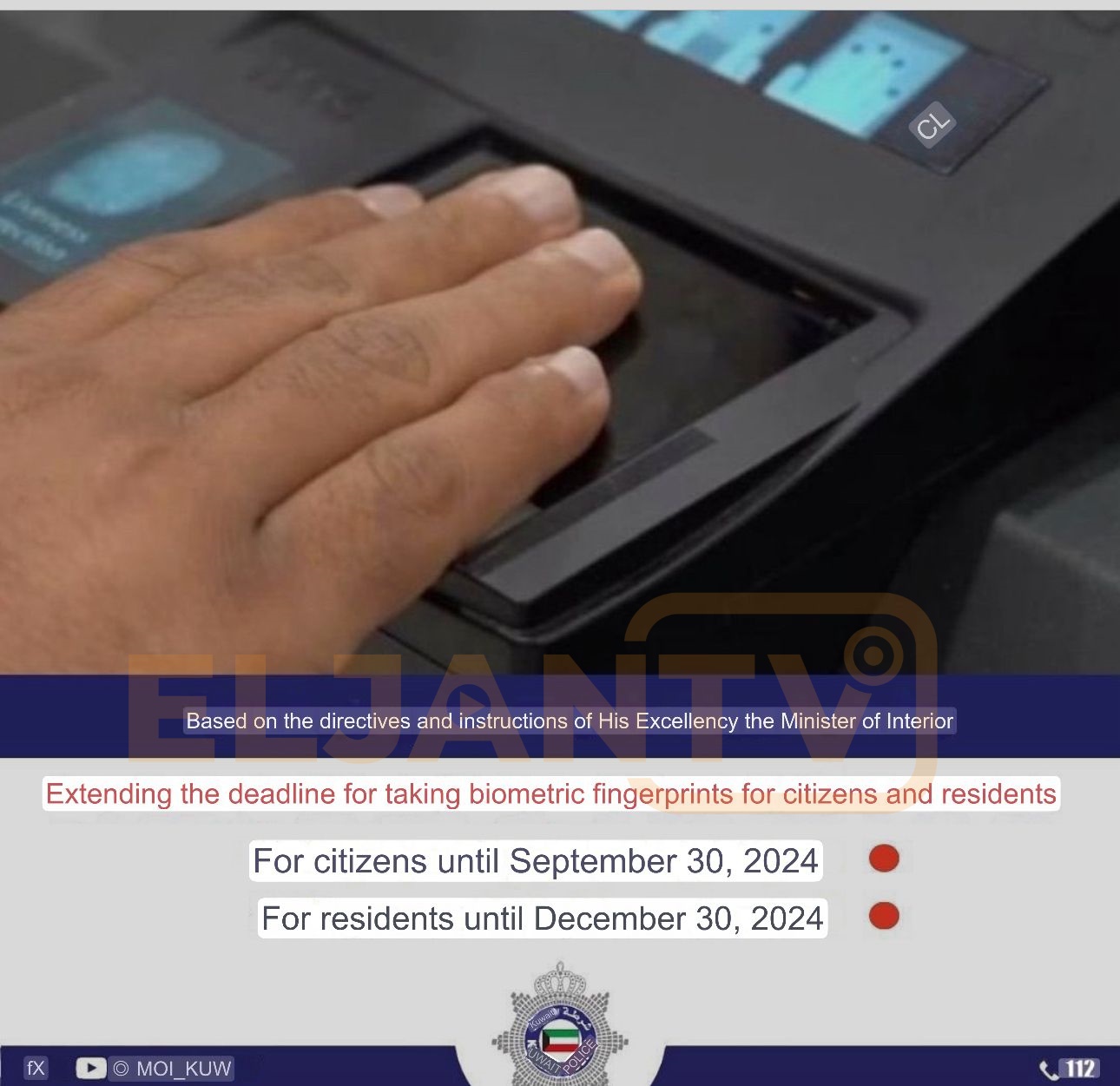 Based on the directions and instructions of His Excellency the First Deputy to the Prime Minister, the Minister of Defense, and the Minister of the Interior, Sheikh Fahd Al-Youssef Al-Sabah, to facilitate citizens and residents and to ensure that the security institution quickly completes the work, the deadline for taking biometric fingerprint for citizens has been extended until September 30, 2024 and for residents until December 30, 2024 and determining locations and times Official work to take biometric fingerprint at the General Administration of Criminal Evidence in the personality investigation departments.