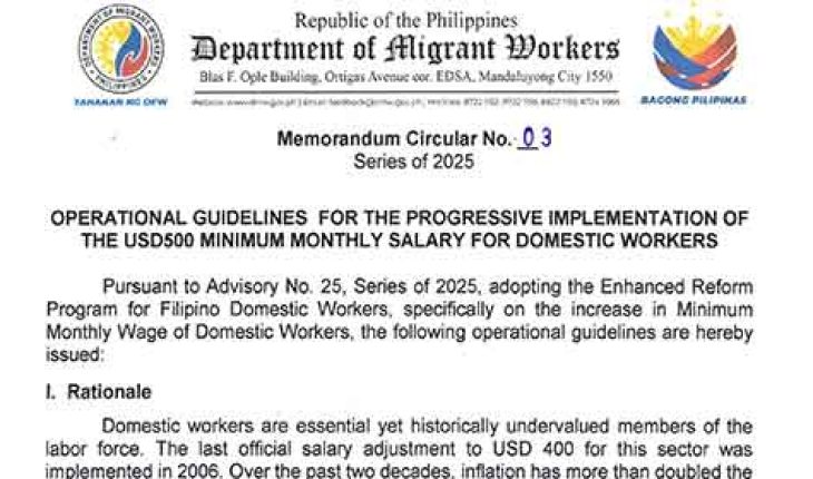 The Department of Migrant Workers (DMW) formalized the policy through Memorandum Circular No. 03, series of 2025, directing all Migrant Workers Offices (MWOs) worldwide to implement the new wage rate and ensure full compliance among foreign employers and recruitment agencies.