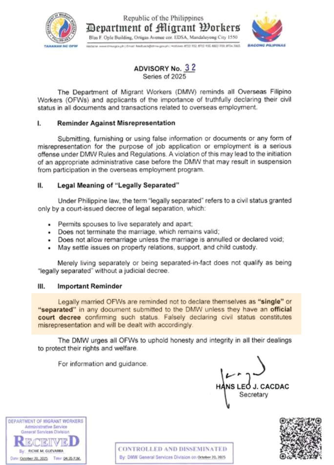 Mandaluyong City, Philippines — Naglabas ng opisyal na paalala ang Department of Migrant Workers (DMW) para sa lahat ng Overseas Filipino Workers (OFWs) at aplikante, hinggil sa kahalagahan ng tapat na pagdeklara ng kanilang civil status sa lahat ng dokumento at transaksyon kaugnay ng overseas employment.