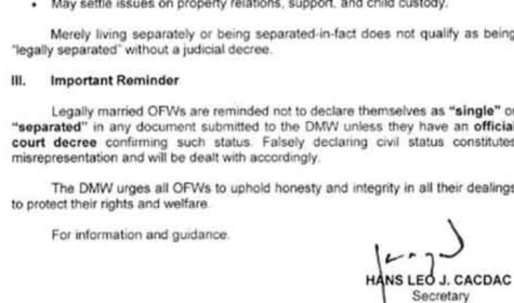 Ipinaliwanag din ng DMW na sa ilalim ng batas ng Pilipinas, ang terminong “legally separated” ay tumutukoy lamang sa isang civil status na opisyal na iginagawad ng korte sa pamamagitan ng court decree of legal separation.
