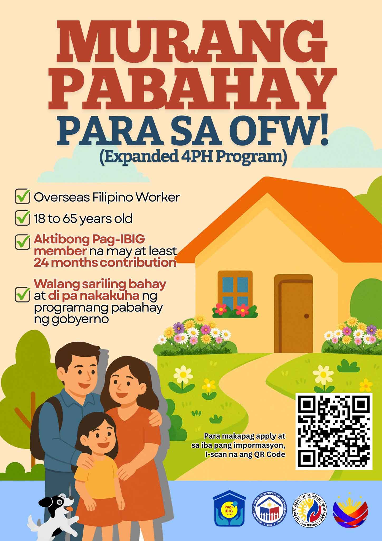 Kasabay ng pagdiriwang ng National Shelter Month, isang magandang balita ang hatid ng pamahalaan sa ating mga Overseas Filipino Workers (OFWs) at kanilang mga pamilya. Muling binuksan ng Department of Migrant Workers (DMW), Department of Human Settlements and Urban Development (DHSUD), at Pag-IBIG Fund ang Expanded 4PH (Pambansang Pabahay Para sa Pilipino Housing Program) — isang inisyatiba na naglalayong bigyan ng pagkakataon ang mga bagong bayani ng bansa na magkaroon ng sariling tahanan.
