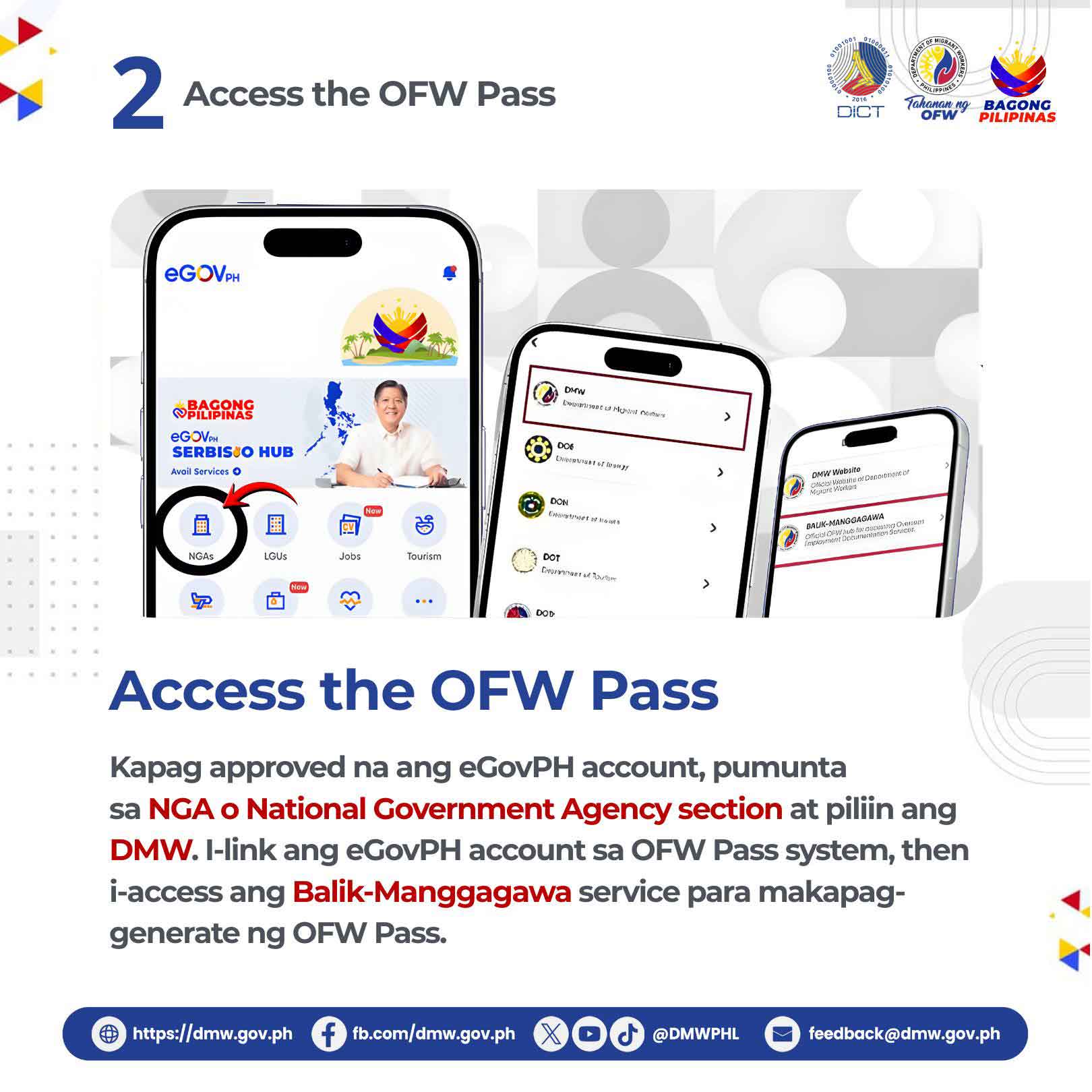 Ang OFW Pass ay isang digital travel exit clearance na pumapalit sa OEC. Makikita ito sa eGovPH App, at awtomatikong nagva-validate kung may active contract ka sa rekord ng DMW. Layunin nitong gawing mas madali ang pagproseso ng papeles ng mga OFW, lalo na ang mga Balik-Manggagawa.
