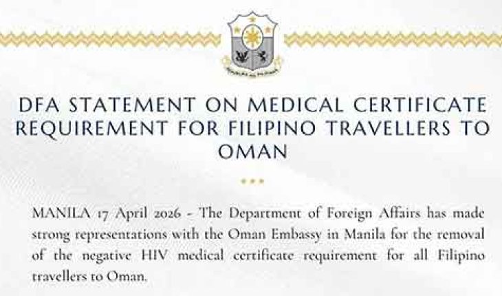 The Department of Foreign Affairs (DFA) has formally urged Omani authorities to remove the requirement for Filipino travelers to present a negative HIV medical certificate prior to entry into Oman.